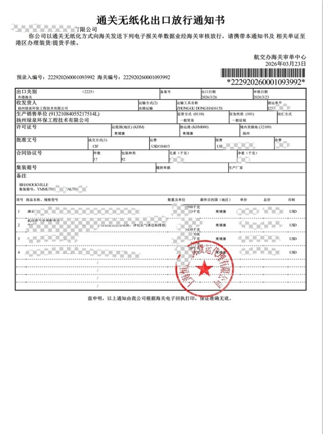 Secondo quanto riferito, i tempi per questa consegna erano sia serrati che altamente efficienti. Il 22, l'attrezzatura è stata prelevata con successo e immediatamente caricata su una nave lo stesso giorno. Successivamente, la nave salpò con successo il 26, trasportando l'attrezzatura in Cambogia tramite via navigabile. Questa consegna non solo dimostra le capacità di esecuzione altamente efficienti di Lvquan Environmental nella gestione della logistica transfrontaliera, ma mette anche in mostra la sua posizione tecnologica leader nel campo del trattamento dei gas di scarico industriali per l’industria della stampa.
