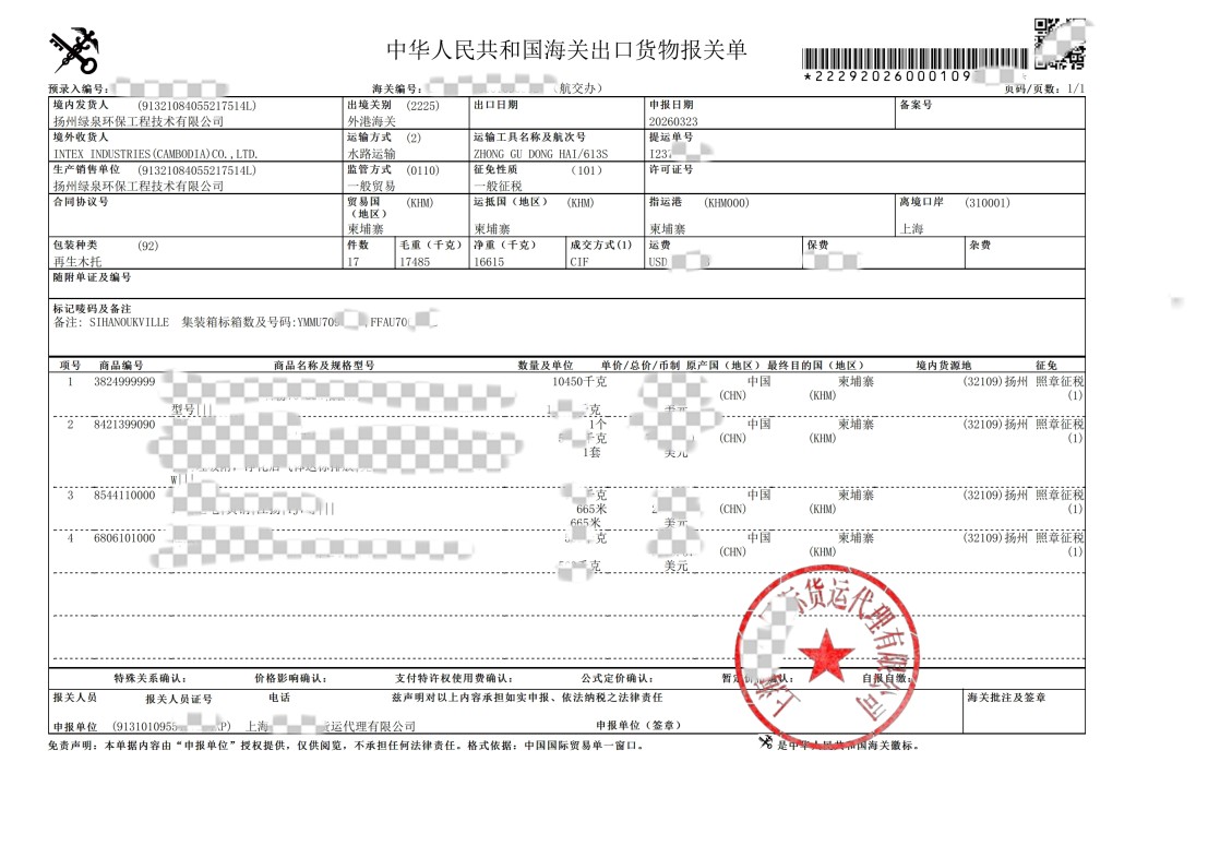 [Phnom Penh, Cambogia, 22 marzo 2026] — Lvquan Environmental Protection Engineering Technology Co., Ltd. ha recentemente completato con successo un'importante consegna transfrontaliera, fornendo una serie di apparecchiature avanzate per il trattamento dei gas di scarico per la stampa al suo cliente cambogiano, INTEX INDUSTRIES (CAMBODIA) CO., LTD.